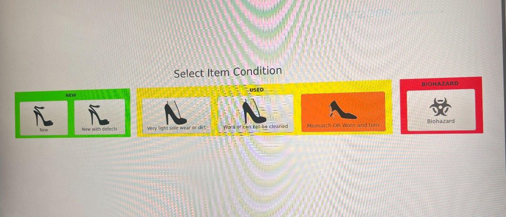 - Worn can’t be cleaned– Can still be worn but has signs of significant wear. (dirty bottoms, deep scuffs / creases, stains)